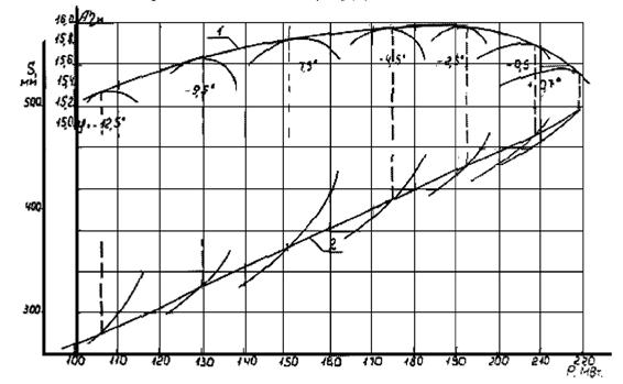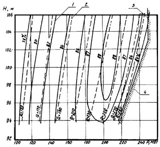Ш.6.1 Для повышения эффективности использования сжатого воздуха при переводе гидроагрегата в режим СК отжатие воды в камере рабочего колеса турбины необходимо производить до оптимального уровня, который не всегда удается определить при проектировании. Поэтому этот уровень уточняют при проведении специальных испытаний. Для этого в первую очередь следует определить верхний предел уровня отжатия воды. С этой целью гидроагрегат переводят в режим СК на ручном управлении. Воду отжимают на 1 - 2 м ниже рабочего колеса. Затем воздух из камеры постепенно выпускают через специальный воздухопровод или клапан срыва вакуума, что приводит к подъему отжатого уровня воды в камере. При этом регистрируют мощность, потребляемая агрегатом из сети, давление в камере и отметка нижнего бьефа. При достижении уровня рабочего колеса происходит захват его лопастной системой с одновременным увеличением потребляемой мощности и гидроагрегат переходит в насосный режим. Момент начала изменения мощности, потребляемой гидроагрегатом из сети, и является критерием достижения уровня рабочего колеса гидротурбины. Таким образом, уровень захвата (УЗ) воды рабочим колесом при давлении в камере Рв и уровне нижнего бьефа УНБ составит