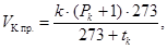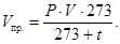Ш.5.1 При переводе гидроагрегата в режим СК сжатый воздух из пневмосистемы в основном расходуется на заполнение камеры рабочего колеса и потери в нижний бьеф. Для определения расхода воздуха используется формула приведенных объемов, т.е. объем воздуха, содержащийся в емкости V (м3), при давлении Р (МПа) и температуре t (°C) приводится к объему при атмосферном давлении и температуре 0 °С, по формуле:
