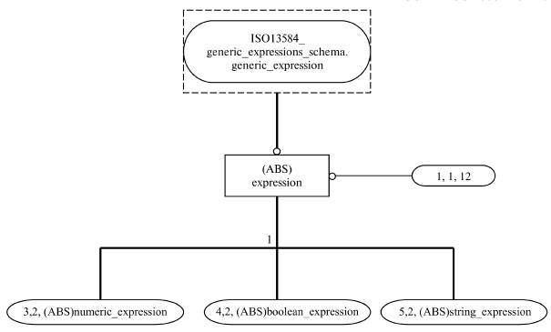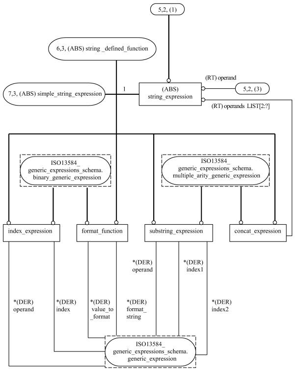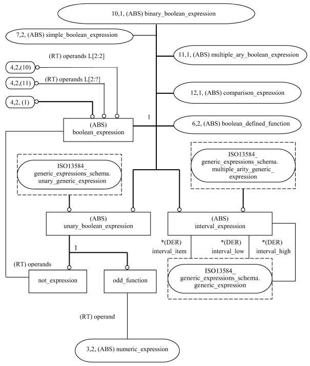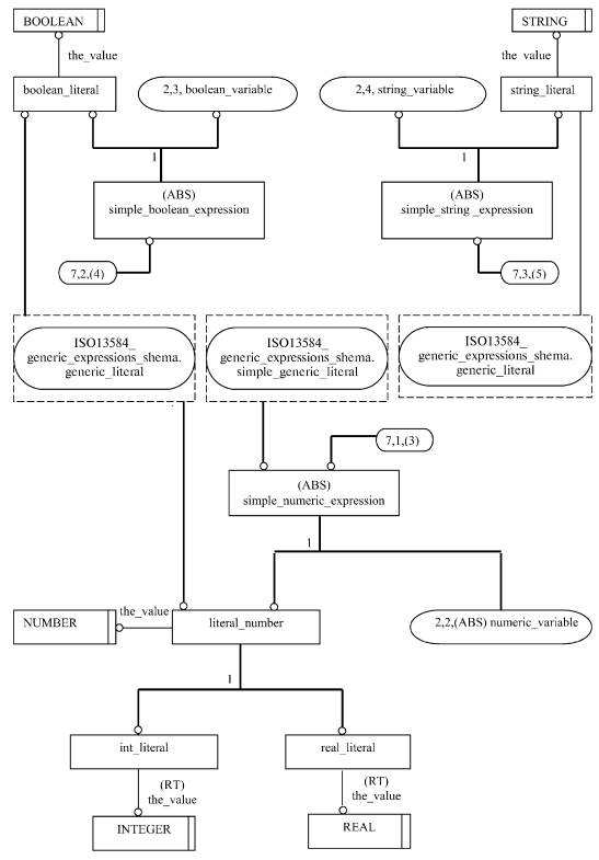 - EXPRESS-схему для выражений, которая моделирует подмножество допустимых выражений на языке EXPRESS, требования к которому установлены в ИСО 10303-11, соответствующее целому, вещественному, булевому и строковому типам данных. В этой схеме используются ресурсы, определенные в схеме обобщенных выражений.