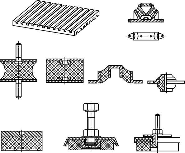Конструкция применяемой эластомерной пружины зависитоттипа нагрузки (силы сжатия, силы сдвига, крутящие и изгибные моменты, их сочетание). Некоторые примеры пружин из эластомерного материала показаны на рисунке А.1.