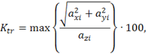 Относительную величину поперечных составляющих ускорения на столе ударного стенда Ktrв процентах, определяют при заданном ударном ускорении и длительности импульса по формуле