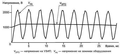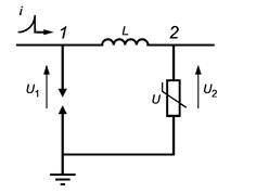Для лучшего понимания проблемы на рисунке К.12 показан типичный пример координации двух цинковых варисторов, разделенных катушкой индуктивности. УЗИП 2 имеет более низкие значения Up и In. Вследствие влияния индуктивности на фронт импульса основной ток проходит через УЗИП 1, а ток через УЗИП 2 будет постепенно увеличиваться с постоянной времени, определяемой индуктивностью и характеристикой УЗИП 2. Таким образом, со временем все большая и большая часть тока будет проходить через УЗИП 2.