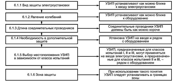 Раздел 6 является основным в настоящем стандарте. В нем описаны воздействия и связанные с ними (как приведено в разделе 4) характеристики УЗИП (как приведено в разделе 5). На отводящей линии защита, обеспечиваемая УЗИП, может иметь обратное воздействие на установку. На разных этапах подбора УЗИП могут возникнуть проблемы координации при установке в одной линии нескольких УЗИП, применяемых в установке (уточнения по вопросам координации могут быть в приложении F).