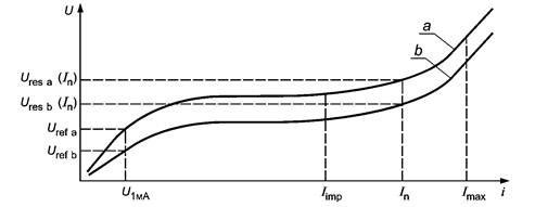 - допуски характеристик компонентов, используемых в УЗИП, могут привести к неопределенности действительного значения остаточного напряжения при любом токе. Кроме того, значение, которое обычно получают от изготовителя, -это защитный уровень Up, который предусматривает резерв, так что действительное напряжение может быть на 25 % ниже, чем указано;