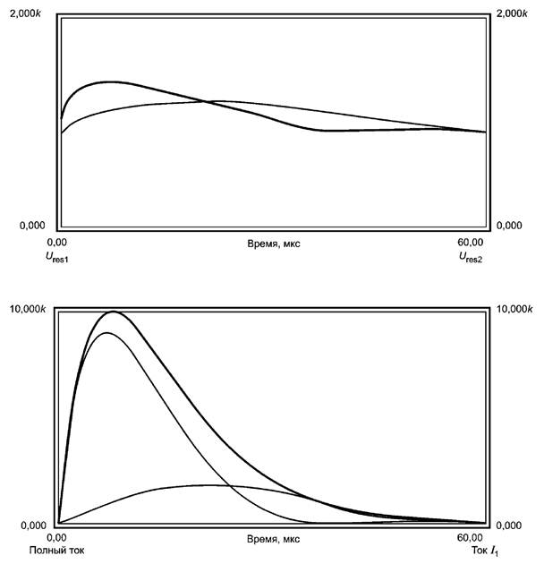 На рисунке К.12 показан общий ток, токи, проходящие через УЗИП1 и УЗИП 2 на напряжения на зажимах УЗИП 1 и УЗИП 2.