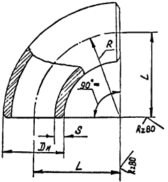 Пример условного обозначения при заказе отводов с углом 90° Дн = 159 мм, S = 6 мм из стали 15Х5М: