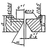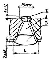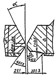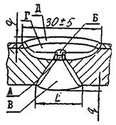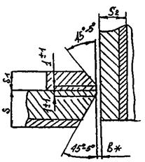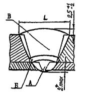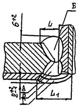 Соединение Б. Кольцевые сварные соединения в пределах основной обечайки, днищ с корпусом, соединительных камер, люков, штуцеров; кольцевые и меридиальные соединения, собираемые из лепестков днищ. Стыковые сварные соединения конических переходов и днищ с цилиндрическими обечайками должны рассматриваться как сварные соединения типа «Б» при условии, что угол (см. рис. А.1) не превышает 30°. Если указанный угол больше 30°, сварные соединения следует отнести к типу «В».
