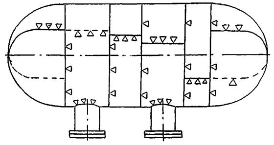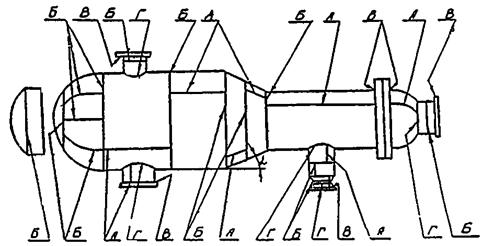 На чертеже показана упрощенная схема расположения типовых сварных соединений и сборочных единиц на аппарате условной конструкции.