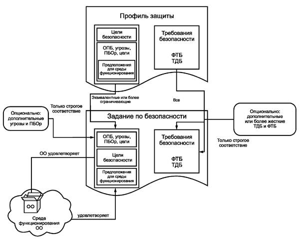 Строгое соответствие ориентировано на разработчиков ПЗ, которым требуются свидетельства, что требования ПЗ удовлетворены, что ЗБ является примером реализации ПЗ, хотя при этом ЗБ может быть более широким, чем ПЗ. По существу ЗБ определяет ОО, который выполняет, по крайней мере, что определено в ПЗ, и среду функционирования, которая выполняет как максимум что определено в ПЗ.