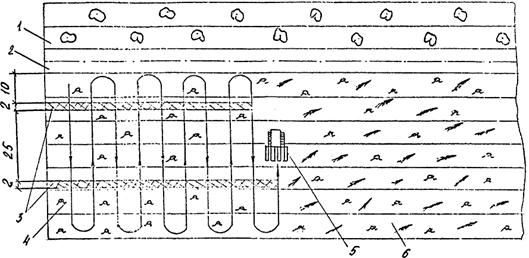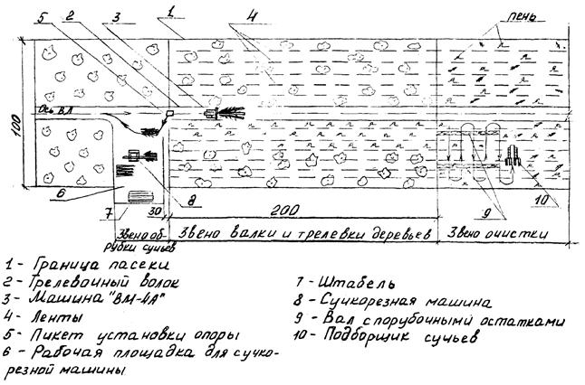 1 - Лес; 2 - Магистральный волок; 3 - Валы сучьев; 4 - Очищенная площадь; 5 - Подборщик сучьев ПСГ-3; 6 - Неочищенная площадь