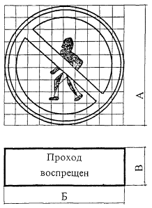 Круг красного цвета с белым полем внутри, белой каймой по контуру знака и символическим изображением черного цвета на внутреннем белом поле, перечеркнутом наклонной полосой красного цвета (угол наклона 45°, слева сверху направо вниз). Ширина кольца красного цвета должна быть 0,09 - 0,1 внешнего диаметра, ширина белой каймы по контуру знака - 0,02 внешнего диаметра.