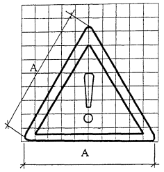 Равносторонний треугольник со скругленными углами желтого цвета, обращенный вершиной вверх, с каймой черного цвета шириной 0,05 стороны и символическим изображением черного цвета.