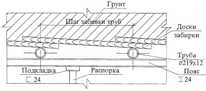 Крепление вертикальных стенок траншеи выбрано с использованием стальных труб Æ 219´12 мм, поясов из стальных балок двутавровых № 24 и распоров из бревен диаметром 200 мм согласно рисунку 3. Распорами могут служить как деревянные, так и металлические элементы. Варианты крепления вертикальных стенок траншей с использованием труб или балок, поясов и распоров с указанием их сечений и материала определяются проектом.