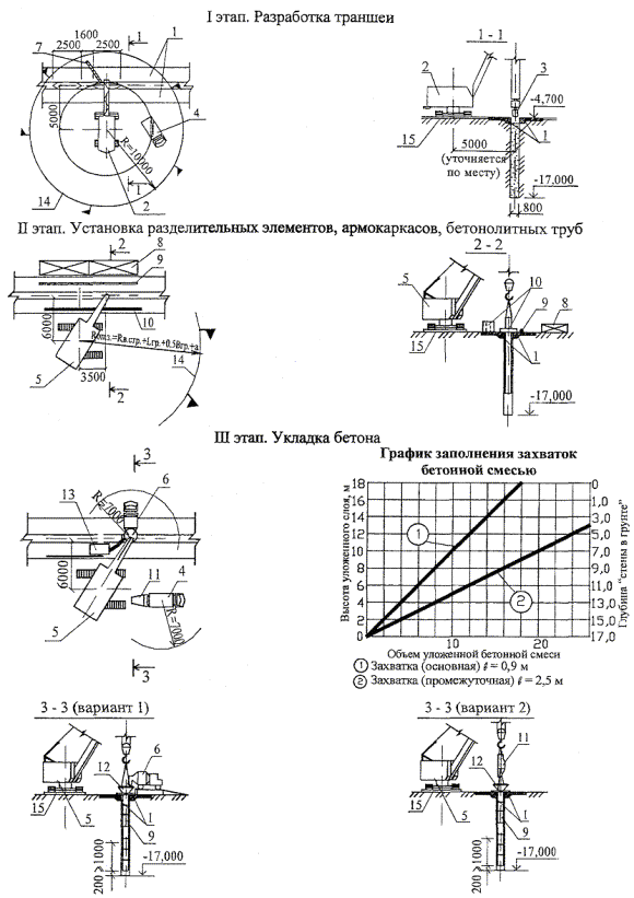 - укладка бетона в траншею методом вертикально перемещающейся трубы (ВПТ).