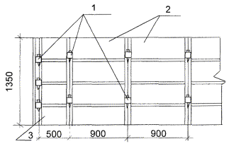 1 - клиновые замки системы «Мева»; 2 - опалубочные щиты; 3 - доборный элемент.