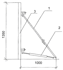 1 - консольная подпорка с соединительным шарниром, крепящимся фланцевым болтом к функциональной распорке; 2 - функциональная распорка; 3 - щит опалубки.