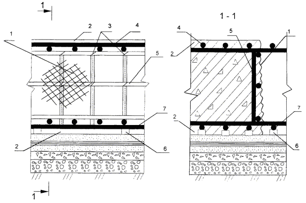 1 - металлическая сетка; 2 - защитный слой бетона; 3 - места крепления сетки вязальной проволокой; 4 - верхняя арматура; 5 - плоский поддерживающий каркас; 6 - пластмассовые фиксаторы; 7 - нижняя арматура.