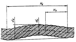 7.9. Волнистость каната характеризуется шагом и направлением ее спирали (рис. 12). При совпадении направлений спирали волнистости и свивки каната и равенстве шагов спирали волнистости Нв и свивки каната Н канат бракуется при dв > 1,08d, где dв - диаметр спирали волнистости, d - номинальный диаметр каната.