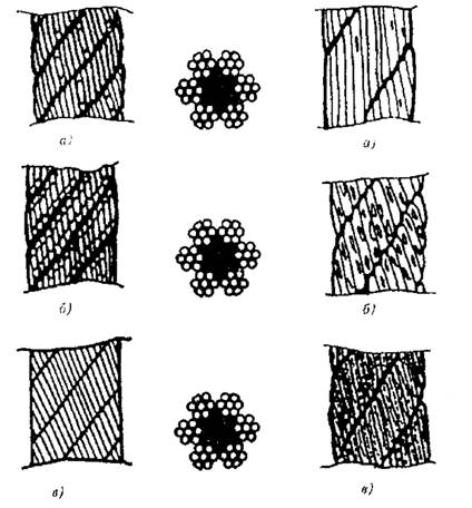 Примечания: 1. n - число несущих проволок в наружных прядях каната; d - диаметр каната, мм; ЛК, ТК - соответственно линейное, точечное касание проволок смежных слоев; О, Р - соответственно, одинаковые и разные проволоки в слоях; З - наличие проволок заполнения в слоях.