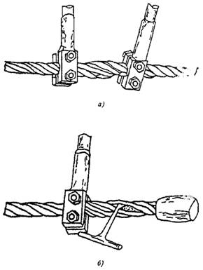 Внутренний контроль каната производится механическим способом для частичной оценки состояния его внутренних проволок (наличие обрывов и коррозии). При внутреннем контроле на ненагруженном канате закрепляются два зажима (рис. 1, а) на расстоянии 0,2 - 0,4 м (для канатов, соответственно, диаметром 20 - 40 мм) фиксируя положение одного зажима, второй вращают в направлении, противоположном направлению свивки каната, при этом наружные пряди раскрываются и отходят от сердечника. Проскальзывание зажимов по канату и деформирование прядей каната при его раскручивании не допускается.