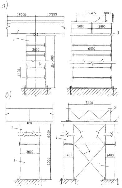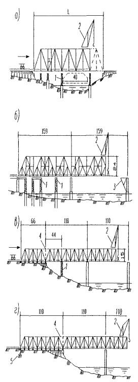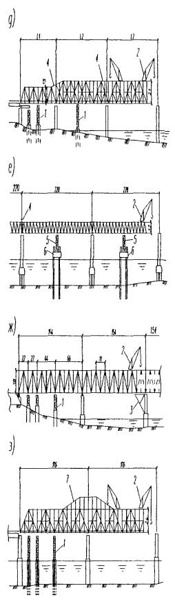 а - опоры и пролетные строения временного моста; б - временная опора для монтажа стальных пролетных строений