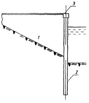 3.11 шпунтовая стена: Сплошная тонкая вертикальная или наклонная стена из забитых в грунт шпунтовых свай (шпунтин), предназначена для восприятия, в основном, горизонтальных нагрузок и, прежде всего, давления находящегося за ней грунта.