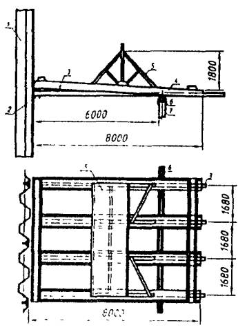 1 - массив грунта; 2 - шпунт типа «Ларсен»; 3 - шапочный брус; 4 - распределительная балка; 5 - анкерная тяга; 6 - анкерная свая