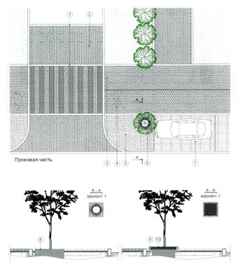 1- бортовой камень гранитный; 2 - приподнятый пешеходный переход (см. 5.2.5);3 - тротуар (мощение «елочка 45°» с заполнением швов песком с обработкой стабилизатором); 4 - велосипедная дорожка; 5 - мощение гранитной шашкой с заполнением швов растворами на основе трассово-цементных вяжущих; 6 - растительность; 7- автостоянка; 8 - чугунная решетка; 9 - бортовой камень; 10 - гравий закрепленный стабилизатором на основе эпоксидных смол