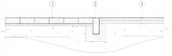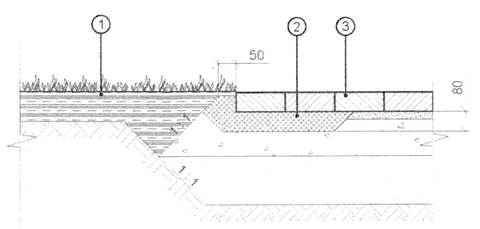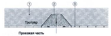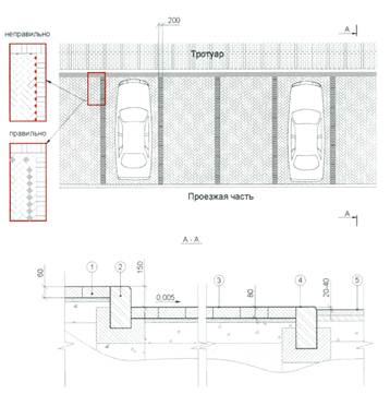 1- дорожное покрытие тротуара из плит/камней мощения высотой 60 мм; 2 - бортовой камень; 3 - дорожное покрытие автостоянки из плит/камней высотой 80 мм;