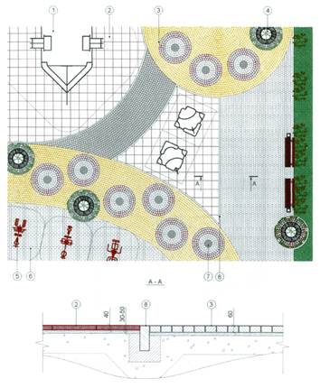 1- детское игровое оборудование; 2 - «мягкое» покрытие из резиновых плит; 3 - мощение; 4 - растительность; 5 - уличные тренажеры; 6 - мощение; 7 - заполнение центра круга мелкоразмерными природными камнями с закреплением растворами на основе вяжущих; 8 - бортовой камень