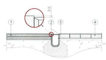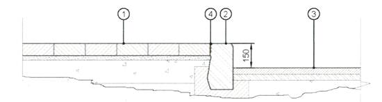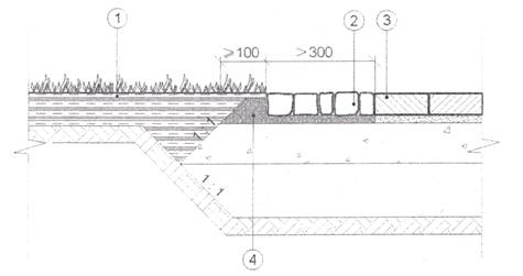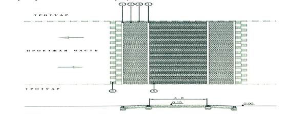 1 - мощение искусственным камнем; 2 - бортовой камень; 3 - тротуар; 4 - шашка из естественных каменных материалов (базальт, гранит, диабаз)