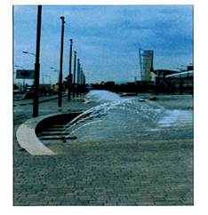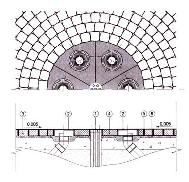 1 - сопла фонтана; 2 - трап водосборный; 3 - искусственные камни мощения; 4 - плиты гранитные; 5 - швы, заполненные водонепроницаемыми растворами; 6 - монтажный (выравнивающий) слой из водонепроницаемого раствора