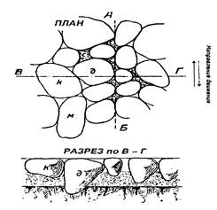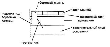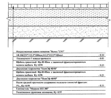 Покрытие включает собственно покрытие из камней мощения или плит высотой сечения 40 - 100 мм, заполнение швов между искусственными камнями, монтажный (выравнивающий) слой толщиной 3...5 см в уплотненном состоянии.
