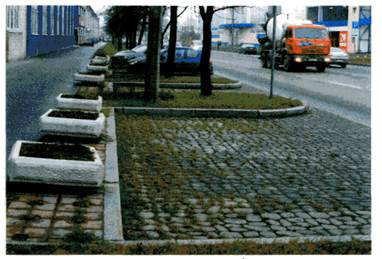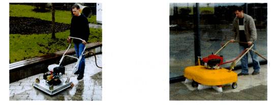 9.3.4 Дорожные покрытия из плит/камней мощения обычно светлее, чем, например асфальтобетонные. Поэтому кроме гигиенического значения их очистка обуславливается эстетическими требованиями. Очистку покрытий от пыли и грязи можно выполнять с помощью тротуароуборочных машин и при необходимости использовать системы для очистки под высоким давлением и уличные пылесосы (рисунок 9.2). При очисткой водой следует следить, чтобы не размывался материал заполнения швов.