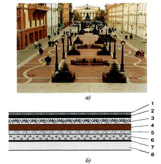 Дорожная одежда с покрытием из плит/камней мощения - многослойная конструкция, воспринимающая внешнюю нагрузку и передающая ее на подстилающий грунт. Дорожная одежда состоит из покрытия, выполненного из камней мощения (плит), несущего и (при необходимости) дополнительного слоя основания, а также грунта земляного полотна.