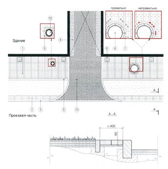 1- тротуар; 2 - защитная полоса газона из мощения; 3 - бортовой камень; 4 - мощение гранитной шашкой с заполнением швов растворами на основе трассово-цементных вяжущих; 5 - бортовой камень; 6 - водосборный лоток открытый; 7- мелкоразмерная диабазовая или гранитная шашка; 8 - люк канализационный; 9 - мелкоразмерная диабазовая или гранитная шашка с заполнением швов сухой песчано-цементной смесью; 10 - смотровой люк; 11 - въезд в арку (мощение «елочка 45°» по направлению движения)