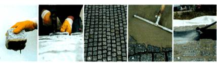 9.3.5 В зимний период, при уборке покрытия не рекомендуется применять средства, содержащие техническую соль. Во избежание разрушения декоративного слоя камня и его лицевой поверхности, нельзя использовать для уборки инструменты с металлической рабочей частью или поверхностью. Отвалы снегоуборочных машин должны быть снабжены резиновыми отбойниками. В качестве антигололедных средств рекомендуется применять песок или гранитную крошку.
