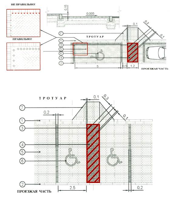 1 - мощение тротуара из искусственных камней; 2 - мощение зоны занижения тротуара перед пешеходным переходом гранитной шашкой; 3 - бортовой камень