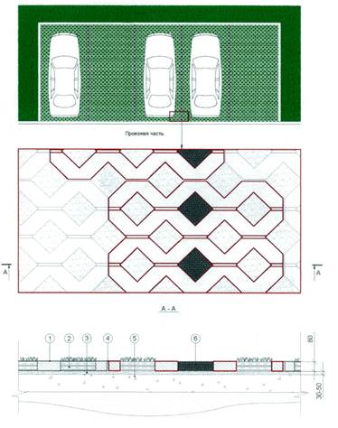 1 - газонная решетка; 2 - растительный фунт; 3 - монтажный (выравнивающий) слой из песка или смеси песка с растительным грунтом; 4 - шов; 5 - основание; 6 - вставка для разметки стояночных мест