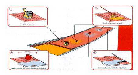 9.1.4 При применении для заполнения швов между искусственными плитами/камнями стабилизаторов песка нельзя ходить по покрытию до тех пор, пока поверхность не высохнет после нанесения материала. Въезд автомобильного транспорта на обработанную поверхность запрещен в течение 24 часов.