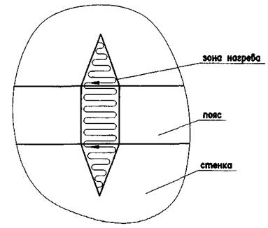 Высота треугольника зоны нагрева h = (0,4 ... 0,5)Н, где Н - высота секции или ширина пояса (черт. 3).