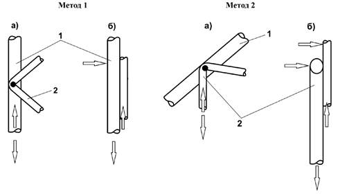 В.1 Испытание на срез* в местах сварки продольных стержней и диагоналей каркасов арматурных пространственных может выполняться одним из двух методов, изображенных на рисунке В.1. При этом диагонали каркасов жестко фиксируются, поворот образца не допускается.