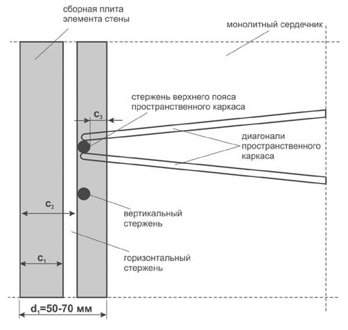 Б.1.2 Величина защитного слоя бетона от поверхности элемента несъемной опалубки до вертикального арматурного стержня и до продольных стержней верхнего и нижнего поясов каркаса арматурного пространственного (см. обозначение С2 на рисунке Б.1) должна быть указана в проектной документации, но не менее диаметра вертикального арматурного стержня.