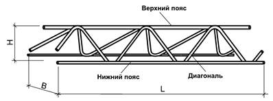 Примечание - В марке пространственного каркаса указывают тип и высоту каркаса (см), диаметр нижних продольных стержней (мм), диаметр поперечных арматурных стержней диагоналей (мм), диаметр верхнего продольного стержня (мм).