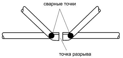 Г.1 Испытания на растяжение* верхнего и нижнего поясов каркасов арматурных пространственных необходимо производить со сварной точкой в пределах длины измерения, как показано на рисунках Г.1 и Г.2.