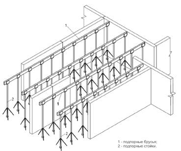 - подпорные брусья, располагаемые в поперечном направлении по отношению к пространственным арматурным каркасам, следует устанавливать до начала монтажа. Подпорные брусья устанавливаются на подпорные стойки, опирающиеся на нижележащие конструкции. Отметка верха брусьев соответствует проектной отметке низа перекрытия (рисунок Ж.1);