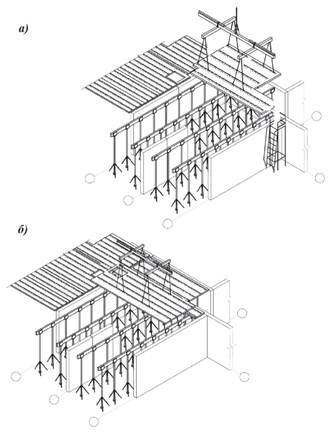 Ж.2 Сборные элементы перекрытия устанавливаются непосредственно на выверенные по отметкам подпорные брусья. Первый элемент монтируют с монтажных площадок (см. а) на рисунке Ж.2), последующие - со смонтированной части перекрытия (см. б) на рисунке Ж.2) и с монтажных площадок, установленных с той стороны, где элементы перекрытия еще не смонтированы. При укладке и выверке необходимо обеспечить проектное положение сборного элемента в плане;