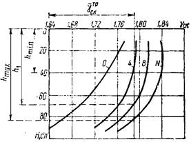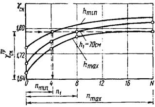 Рисунок В.4 - Зависимость плотности сухого грунта от количества проходов катка по одному следу γск = f(N)n для различных значений толщины слоя грунта в интервале (от hmin до hmax)