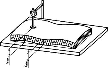 7.2.3 При помощи измерительного прибора (см. 5.3) определяют точки, в которых расстояние от верхней лицевой грани образца до плоского основания является максимальным и минимальным, как показано на рисунке 2. Измеряют в этих точках максимальное Ymax и минимальное Ymin расстояния с погрешностью не более ± 0,5 мм.