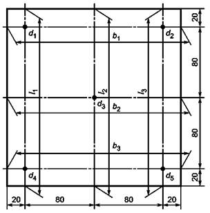 При условиях кондиционирования определяют с погрешностью не более 0,1 мм первоначальную длину и ширину каждого образца l0 и b0, измеряя каждый размер в трех положениях: l01, l02, l03 и b01, b02, b03 и первоначальную толщину d0 в пяти точках: d01, d02, d03, d04, d05, как показано на рисунке 1, в соответствии с EN 12085.